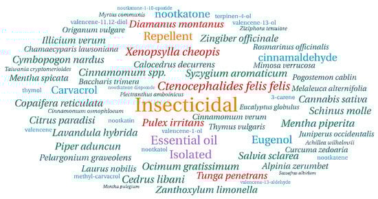 A total of 25 studies met the inclusion criteria, reporting in vitro or in vivo biological activity of essential oils and/or their bioactive compounds against fleas, either through controlled laboratory assays or formulated preparations. Among these, 16 studies exclusively evaluated EOs, five assessed both EOs and their major bioactive compounds, and one investigated isolated bioactive compounds only. Furthermore, four studies focused on the development of formulations targeting fleas, of which two employed bioactive compounds as active ingredients and two utilized whole EOs, as illustrated in the word cloud summarizing frequent keywords (Figure 2).