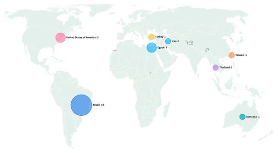Global distribution of the studies selected for this review, according to country of origin. Flourish online platform (https://flourish.studio/, accessed on 9 October 2025).