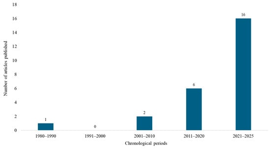 In relation to the temporal distribution of publications, studies were first reported between 1980 and 1990 (n = 1), followed by a gap in the 1990s, with no publications identified in that decade. The number of studies gradually increased in the following years, with two articles published between 2001 and 2010, six between 2011 and 2020, and a marked rise to 16 publications from 2021 to 2025. This trend indicates noteworthy growth in research interest and productivity over the last decade, reflecting the increasing scientific and applied relevance of natural products for flea control (Figure 4).