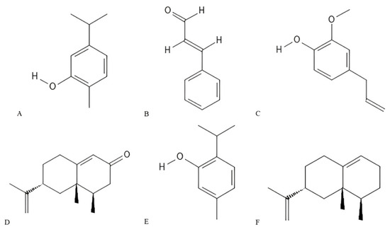 Chemical structures of some major constituents evaluated for flea control activity: carvacrol (A); cinnamaldehyde (B); eugenol (C); nootkatone (D); thymol (E); and valencene (F). Structures were generated using PubChem Sketcher V2.4.