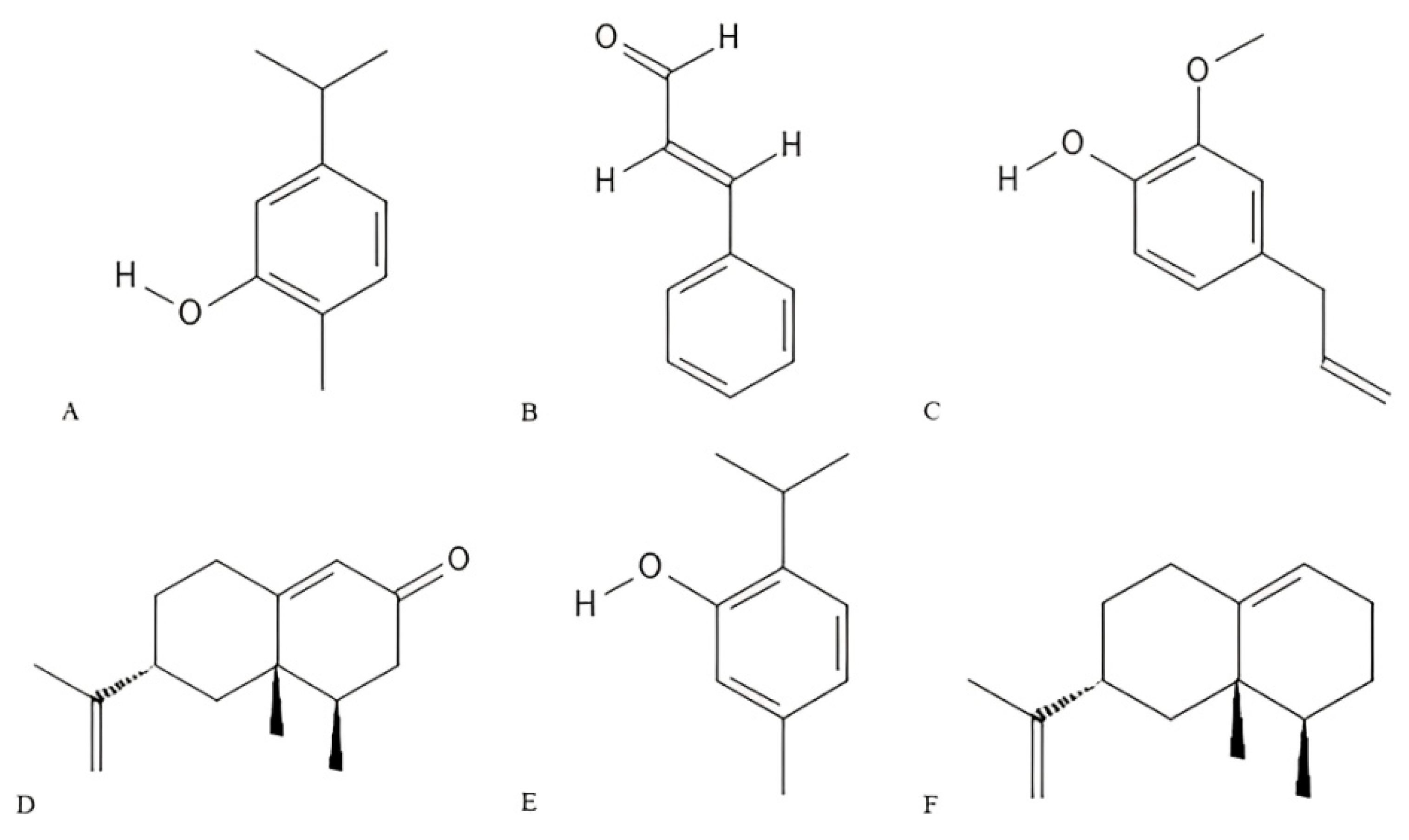 - Corrêa, E.J.A.; Carvalho, F.C.; de Castro Oliveira, J.A.; Bertolucci, S.K.V.; Scotti, M.T.; Silveira, C.H.; Guedes, F.C.; Melo, J.O.F.; de Melo-Minardi, R.C.; de Lima, L.H.F. Elucidating the Molecular Mechanisms of Essential Oils’ Insecticidal Action Using a Novel Cheminformatics Protocol. Sci. Rep. 2023, 13, 4598. [Google Scholar] [CrossRef]