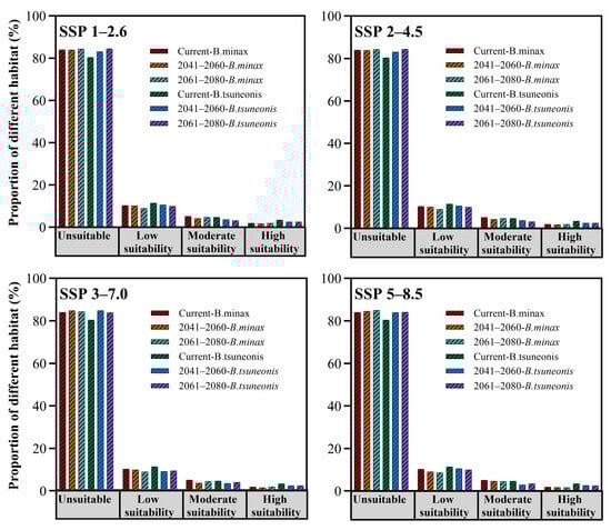 Under four future climate scenarios (SSP1–2.6, SSP2–4.5, SSP3–7.0, and SSP5–8.5), both B. minax and B. tsuneonis exhibit overall declines in climatic suitability (Figure 4). Under the SSP1–2.6 scenario, the total suitable habitat for B. minax expands slightly, with high-suitability areas increasing by approximately 27% during 2061–2080, particularly in eastern Guizhou, western Hunan, southern Hubei, western Anhui, and central Sichuan. In contrast, B. tsuneonis shows a contraction in suitable habitat, with moderate-suitability areas decreasing by 34% by 2061–2080, mainly in southern Chongqing, Guizhou, and western Hunan. Under the SSP2–4.5 scenario, B. minax initially exhibits a modest increase in total suitable habitat from 2041 to 2060, followed by a subsequent decline. Meanwhile, B. tsuneonis experiences continuous habitat contraction across low-, moderate-, and high-suitability classes, progressively retreating toward a core distribution zone centered in Guizhou. In the SSP3–7.0 scenario, both species undergo reductions in total suitable habitat during 2041–2060, followed by a partial rebound in 2061–2080, primarily attributable to shifts in moderate-suitability zones. However, B. tsuneonis experiences a substantial net reduction during 2041–2060, driven by losses in both low- and high-suitability habitats. Similarly, under the high-emission SSP5–8.5 scenario, B. tsuneonis continues to lose suitable habitat as both low- and high-suitability areas shrink. In contrast, B. minax shows a slight increase in habitat suitability during 2041–2060, mainly due to the expansion of low-suitability areas, followed by a notable decline by 2061–2080 (Figure 5).