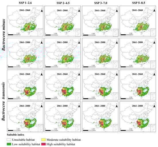 This study analyzed the relationship between the suitable habitats of B. minax and B. tsuneonis in China and various environmental factors using the MaxEnt ecological niche model. By incorporating citrus plant coverage as a key environmental variable, the model achieved higher accuracy and improved predictive performance compared to previous studies. These findings provide valuable scientific insights for forecasting species distributions and developing targeted management and control strategies. At present, B. minax and B. tsuneonis are primarily distributed in southern Chinese provinces, where citrus cultivation is widespread. The spatial distribution of citrus plants plays a pivotal role in shaping the geographical range of these fruit flies. Across all climate scenarios, B. tsuneonis exhibits a consistent trend of habitat contraction. Higher greenhouse gas emission scenarios appear to contribute to a reduction in B. minax and B. tsuneonis suitability, potentially aiding in pest control. Nevertheless, regions engaged in citrus production—particularly eastern Sichuan—should implement enhanced management measures to prevent the invasion and spread of B. minax and B. tsuneonis. However, this study does not incorporate the potential effects of adaptive evolutionary processes, nor does it account for human-mediated dispersal mechanisms, such as long-distance jump dispersal via seedling or plant material transport. The omission of these processes constitutes a significant source of uncertainty in the predictive outcomes and should be considered a priority for refinement in future research, thereby supporting the citrus industry’s sustainable and resilient development in China.