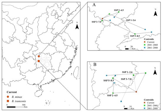 Changes in the centroid shifts in (A) B. minax and (B) B. tsuneonis in China under four shared socioeconomic pathways (SSP).