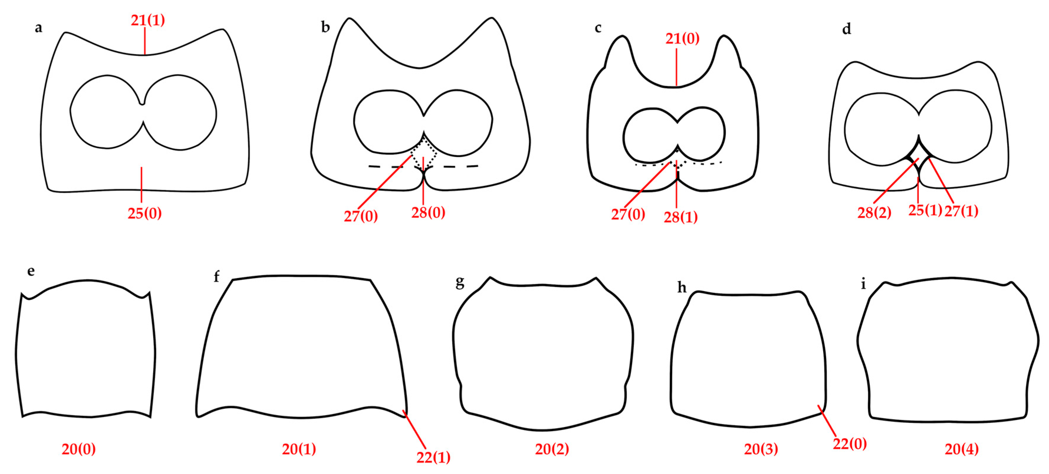 | 23 | Prothorax, postocular lobes, shape: curved (0) (Figure 2d,l); angular (1) |