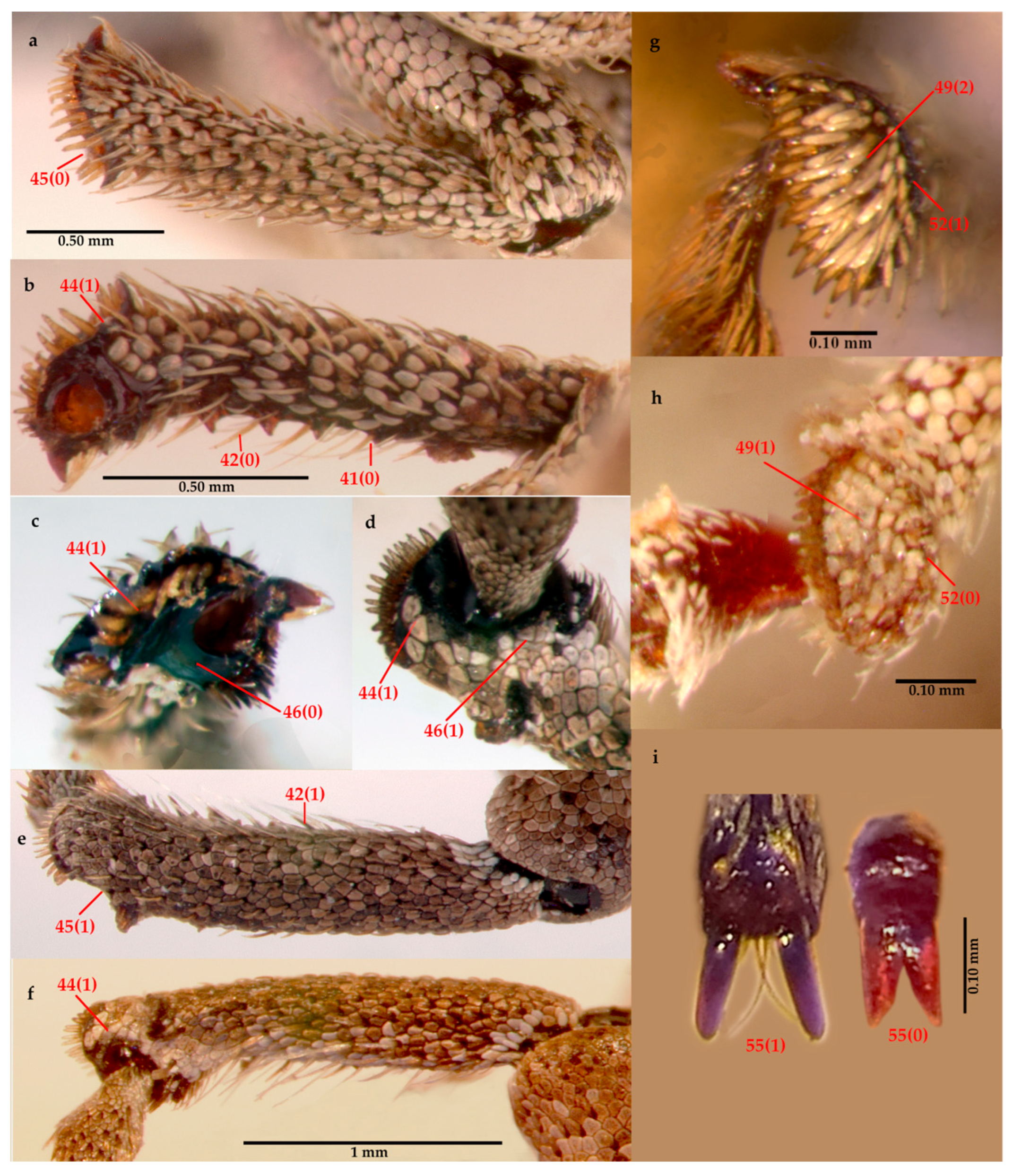 | 44 | Legs, protibia, flat lenticular area apical or subapical on external side: absent (0); present (1) (Figure 4b–d,f) |