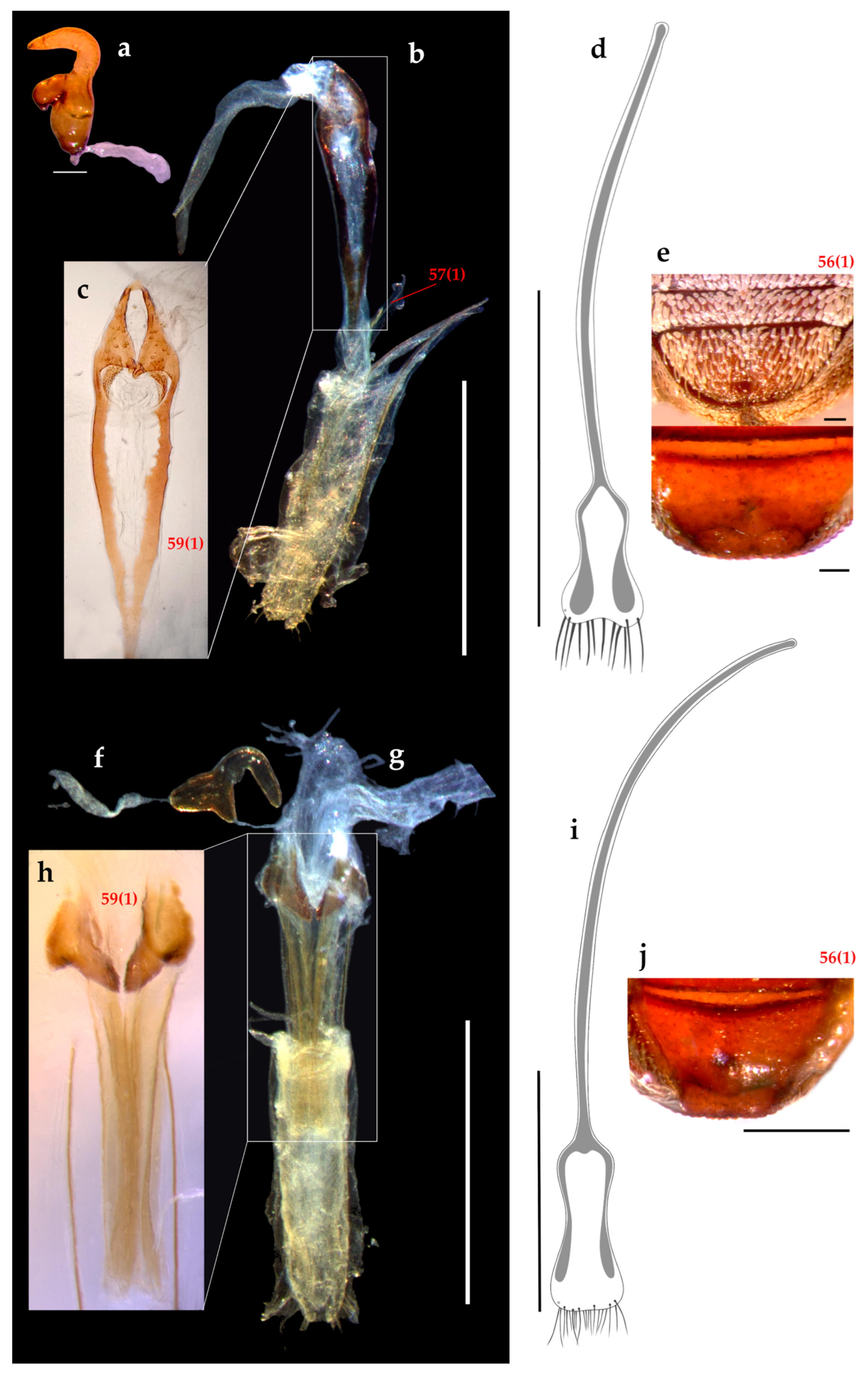 - Female terminalia (Figure 5f–j). Sternite VIII: with apical margin truncate; apodeme 3.3× longer than plate. Ovipositor as long as ventrites 1–5; only ventral baculi present. Vagina with 4 rods and pair of conspicuous conical sclerites at transitional zone between bursa copulatrix and vagina. Spermatheca: collum subconical, ramus oriented transversely to collum.