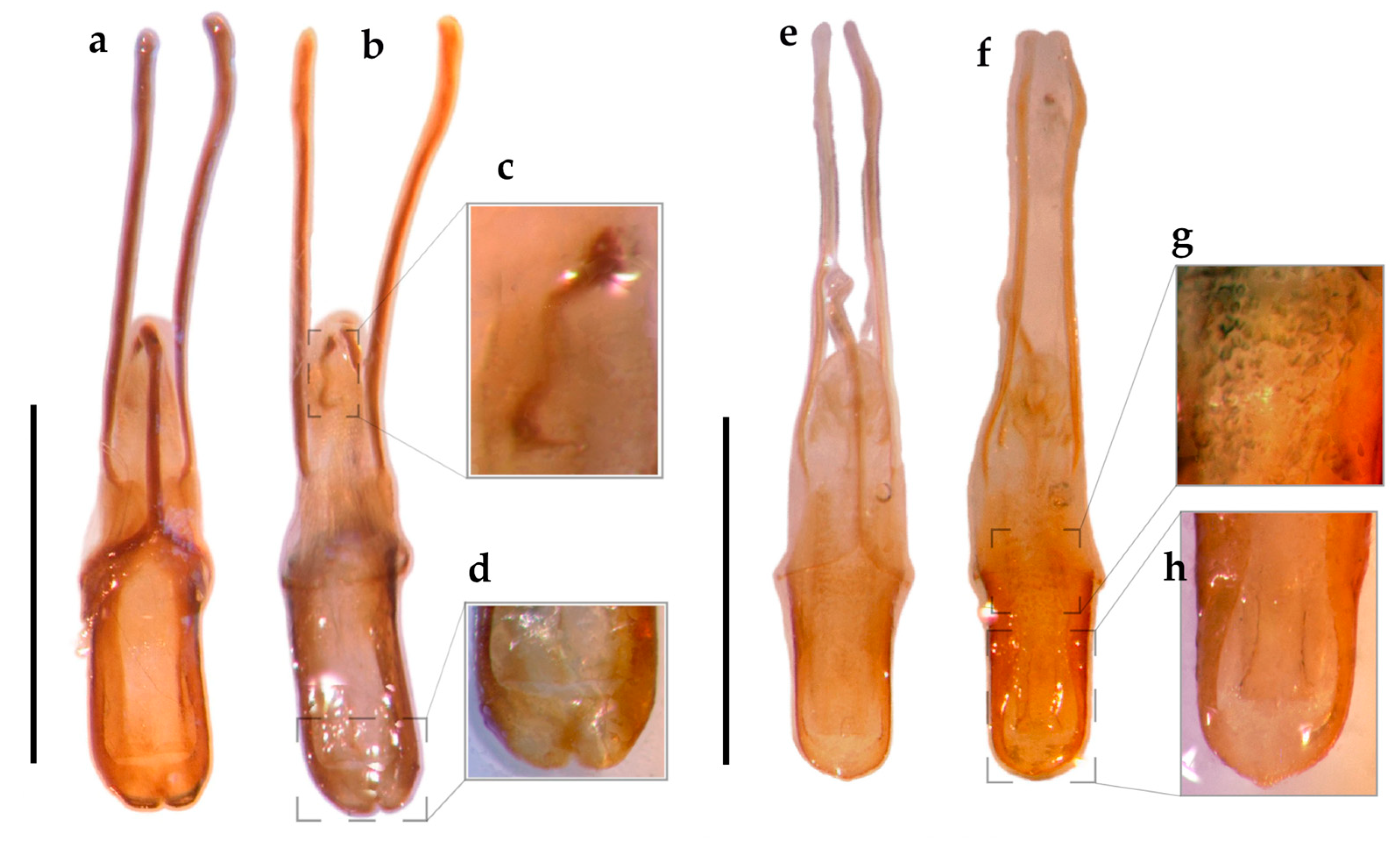 - Male genitalia (Figure 6e–h). Penis as long as ventrites 1–5; penis with apical margin rounded and slightly pointed apex; temones 1.6× longer than penis body; endophallus armed with papillae.