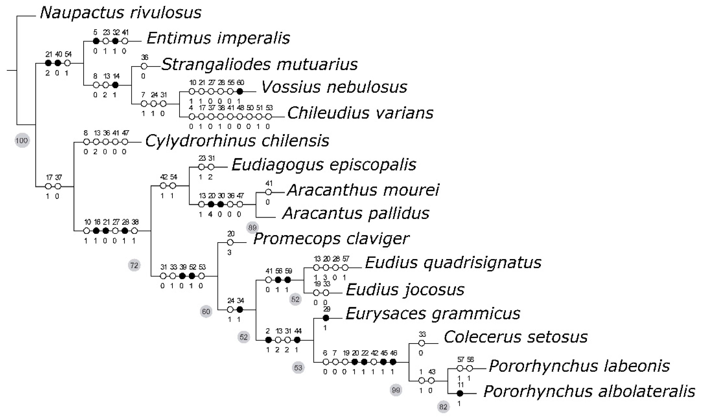 - The search for the most parsimonious tree (MPT) under implied weights (K = 15) produced a single tree (Fit: 3.2; CI: 0.6; RI: 0.7), which topologically coincides with one of the three MPTs obtained under equal weights (L: 124) (Figure 8), which is the preferred phylogenetic hypothesis. The MP tree in Figure 8 shows unambiguous optimization of adult morphological characters, with unique changes (=exclusive synapomorphies) in black, and with homoplastic changes (=non-exclusive synapomorphies) in white. Figures S1 and S2 show character changes according to fast and slow optimization, respectively. The monophyly of tribe Eudiagogini, excluding the genus Chileudius, is firmly justified by: ventrally delimited antennal scrobes (10.1), cavernous sunken prementum (16.1), anterior margin of prosternum deeply emarginate or notched (21.0), poorly defined anterior and posterior margins of process formed by hypomeral lobes and sternellum (27.0), prosternal process of Eudiagogus type (28.1), presence of a scale at each puncture of elytral stria (38.1), additionally (under fast optimization) by: rostral length less than 1× its width (1.1), presence of a spine-like swelling anterior to each metacoxa on metaventrite (35.1), tibial apex with ascending comb well defined and oblique to apical comb (40.1), and also (under slow optimization) by precoxal and postcoxal areas of subequal lengths (29.2). This morphology-based phylogenetic analysis confirms the membership of Eudius in the tribe Eudiagogini and supports the monophyly of the genus, backed by the synapomorphies: presence in female ventrite 5 of a puncture located medially, internally forming a bilobate sclerite as in Figure 5e,j (56.1), presence of sclerites in vagina and bursa of the female, as in Figure 5c,h (59.1), absence of distinct crenulation with stout setae in internal margin of protibiae (41.0), also (under slow optimization) by maxillae partially covered with setae and scales (18.1), corbel of metatibia with setose and scaly vestiture (49.2) and tarsal claws connate at base (55.0). The sister group relationship of Eudius with a clade composed of the genera Eurysaces, Pororhynchus, and Colecerus, is suggested by the synapomorphies: presence of intercoxal process in mesoventrite (34.1) and prothoracic collar complete (24.1). Monophyly of Eudius’s sister group is supported by several synapomorphies, among them apically widened rostrum (2.1) and protibia with subapical or apical external surface modified into a flat lenticular surface, as in Figure 4d,f (44.1). The close relationship between the genera Pororhynchus and Colecerus is supported by several synapomorphies, among which they are worth to mention: subtrapezoidal shape of pronotum (20.1), projected posterolateral angles of pronotum (22.1), presence of subapical notch in protibia (45.1) and presence of scales on the denticular area of protibial apex (46.1).