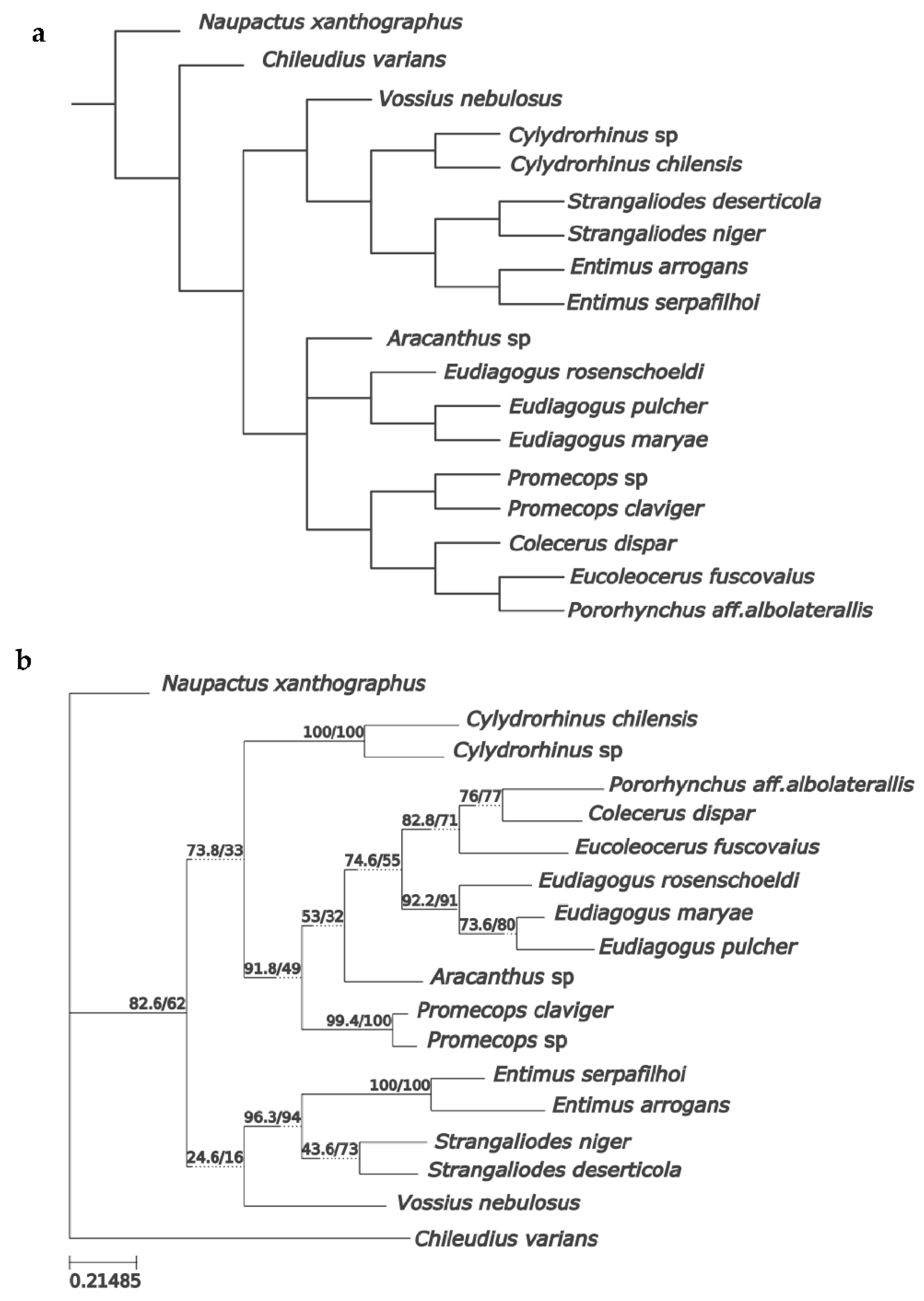 - Results of phylogenetic analyses of the molecular data set using different optimality criteria (maximum parsimony and maximum likelihood) are shown in Figure 9a,b. Although results of MP and ML are not identical in some intergeneric relationships (albeit without significant support), they agree in recovering monophyly of the genera represented by more than one species, in outgroup and ingroup. More importantly, they are congruent in recovering the monophyly of the tribe Eudiagogini with exclusion of the genus Chileudius, which is fully consistent with the results based on morphology. Statistical support values were expected to be low considering that for about 50% of the taxa (most ingroup terminals), the COI barcode was the only marker available.