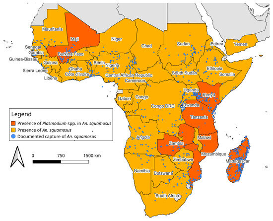 The first documented capture of this species occurred in 1898 in Sierra Leone (Western Africa). Two years later, it was documented in eastern Africa, 5765 km away. By 1904, An. squamosus was documented in Africa’s Eastern, Middle, Southern, and Western regions. Identifying this species at distance points over a short period indicates that this species was widespread throughout Africa before 1898. The known distribution of An. squamosus based on these data reaches its northern limit at Adrar, Mauritania (20.511° N, −13.049° E) [46] and extends as far south as Northern Cape, South Africa (−30.452° S, 21.228° E) [39]. Its most eastern occurrence has been documented in the Sava region of Madagascar (−15.2428° S, 50.4434° W) [46] and the furthest western report was from Thies, Senegal (14.801° N, −16.926° E) [46].