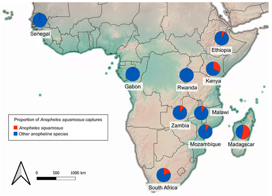 Anopheles squamosus has been implicated as a potential pathogen vector in Zambia, Madagascar, Mozambique, Namibia, Mali, Kenya, and Tanzania (Table 4) [26,29,46,68,69,73,90,91]. Although it is considered a secondary vector species of certain human diseases, such as malaria, secondary vector species may become primary vectors under certain conditions [92]. Distinguishing features of a primary malaria vector include their relative abundance, a high propensity to feed on humans, and sporozoite rate [93]. Most of the published studies on An. squamosus is focused on Zambia and Madagascar. Despite being identified across sub-Saharan Africa, pathogen transmission is unique to a location, as environmental and socio-economic factors impact transmission, which can vary from country to country [94].
