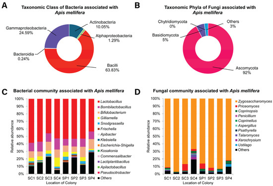 - Yun, J.-H.; Jung, M.-J.; Kim, P.S.; Bae, J.-W. Social Status Shapes the Bacterial and Fungal Gut Communities of the Honey Bee. Sci. Rep. 2018, 8, 2019. [Google Scholar] [CrossRef]