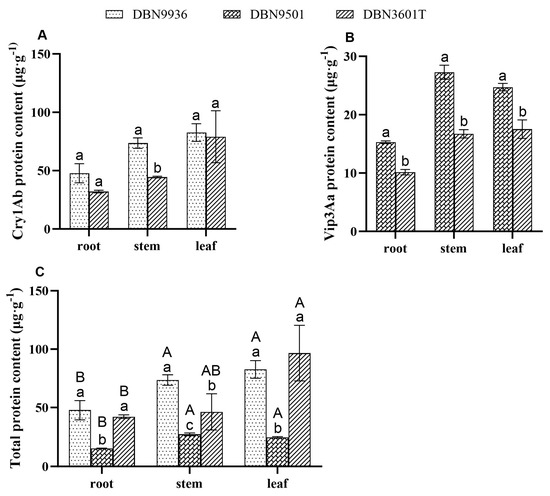 The contents of the Bt protein in the roots, stems, and leaves of different Bt maize seedlings. (A) The contents of Cry1Ab in different Bt maize seedlings in the tissue; (B) The contents of Vip3Aa in different Bt maize seedlings in different tissues; (C) The total Bt protein in different Bt maize seedlings in different tissues. Different lowercase letters indicate significant differences in Bt protein content in the same tissue, and different capital letters indicate that the content of Bt protein in different tissues is significantly different (two-sample t-test and one-way ANOVA, p < 0.05). μg·g−1 means μg of Bt protein per gram of dry weight.