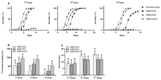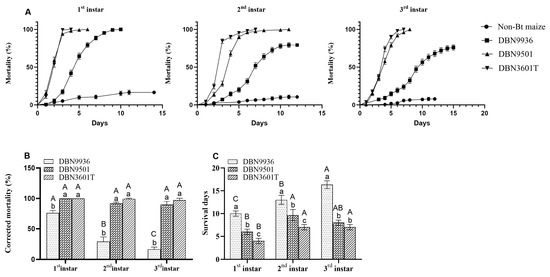 Mortalities of first to third instar larvae on the different maize leaves. (A) Mortality curves of different instar larvae on maize leaves; (B) The corrected mortality of larvae on different Bt maize leaves (7 d); (C) The survival days of different instar larvae on different Bt maize leaves. Different uppercase letters indicate that the corrected mortality and the survival days of different-instar larvae on the same Bt maize were significantly different. Different lowercase letters indicate that the corrected mortality and the survival days of same-instar larvae on different Bt maize were significantly different (one-way ANOVA, p < 0.05).