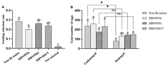 The preference of A. ypsilon on different maize. (A) The selection rate of neonate larvae to different maize leaves; (B) The total number of eggs laid by the moth on the undamaged or slightly damaged Bt maize and damaged non-Bt maize. Different letters indicate significant differences in feeding selection rates and number of eggs between different maize (one-way ANOVA, p < 0.05). The symbol * indicates a significant difference in the number of eggs between damaged non-Bt maize and undamaged or slightly damaged Bt maize; ns means no significance (two-sample t-test, p < 0.05).