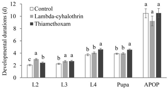 Toxic effects of two pesticide exposures on the development of H. axyridis during its immature stages. L2, second instar larva of H. axyridis; L3, third instar larva; L4, fourth instar larva; APOP, adult pre-oviposition period. Each histogram and error bar represented mean ± SE. Each treatment was replicated 20 times. Different lowercase letters within the same panel denoted significant differences among groups (p < 0.05).