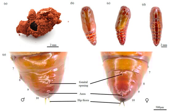 The pupa is brown and obtect, with a smooth surface and no setae. Each abdominal segment from the second to the eighth has a pair of oval spiracles, although the spiracle on the eighth segment is reduced to a fine trace. The abdomen has a pair of V-shaped hip thorns (Figure 3b–e). There is no difference in color or appearance between male and female pupae, but the genital opening of the male pupa is located on the ninth abdominal segment, while that of the female pupa is on the eighth abdominal segment (Figure 3e).