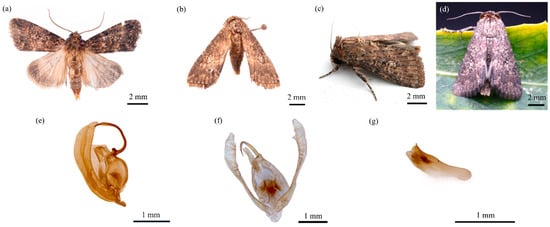 The male genitalia are generally pale yellow. The gnathos is slender and pointed at the tip. The upper part of the tegumen is narrower than the lower part, with elongated bristles on the inner side. The harpago is slightly curved, resembling a scimitar, and bears bristles. The phallobase is elongated and located within the genital chamber (Figure 4e–g).