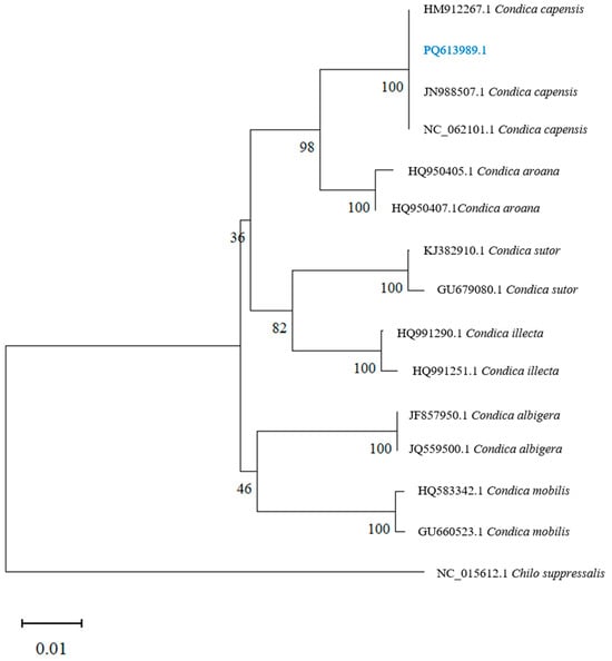 The sequencing results indicated that the sequence (PQ613989.1) has a base pair length of 658 bp, with the following base composition: A = 31.003%, T = 39.666%, C = 15.198%, and G = 14.134%. The average A + T content is 70.669%, and the average C + G content is 29.331%, showing a notable A + T bias, which is characteristic of the mitochondrial COI gene in insects. A BLAST search in NCBI revealed that the sequence shares 100% homology with the sequence of Condica capensis (Lepidoptera: Noctuidae), GenBank accession number NC_062101.1.