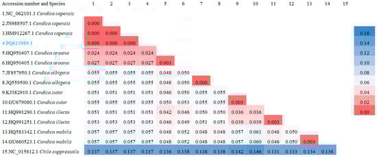 As shown in Figure 5, the phylogenetic analysis revealed that the sequence (PQ613989.1) clustered with sequences of Condica capensis from Canada (HM912267.1), Pakistan (JN988507.1), and Guangdong, China (NC_062101.1), with a genetic distance of 0.000, indicating no significant differentiation among populations from Canada, Pakistan, Guangdong, and Yunnan, China. Regarding interspecific differences within the genus Condica (Figure 6), C. mobilis and C. albigera showed greater genetic distances from C. capensis, with distances of 0.057 and 0.055, respectively. The closest species to C. capensis is C. aroana (HQ950407.1), with a genetic distance of 0.024.