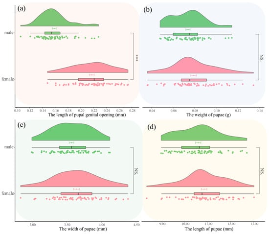 Comparison of morphological differences between male and female pupae of Condica capensis. (a) Violin plot of genital pore length; (b) violin plot of pupal weight; (c) violin plot of pupal width; (d) violin plot of pupal length. Green indicates male pupae, and red indicates female pupae. The value bars with “NS” indicate no significant difference, while asterisks denote statistically significant differences (*** p < 0.001).