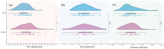 Comparison of morphological differences between male and female adults of Condica capensis. (a) Violin plot of wingspan; (b) violin plot of body length; (c) violin plot of pronotum width. Blue indicates male adults and purple indicates female adults. The value bars with “NS” indicate no significant difference, while asterisks denote statistically significant differences (** p < 0.01).