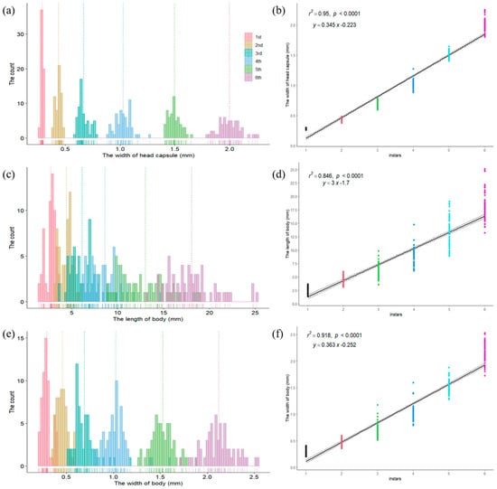 Frequency distribution and regressive relationships of Condica capensis larvae. (a) Frequency distribution of head capsule width; (b) regressive relationship between head capsule width and larval instar; (c) frequency distribution of body length; (d) regressive relationship between body length and larval instar; (e) frequency distribution of body width; (f) regressive relationship between body width and larval instar.