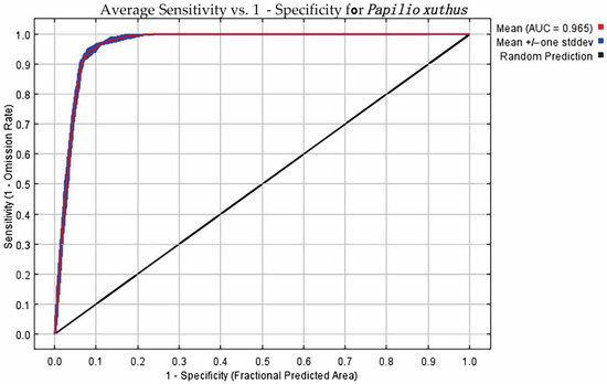 The model’s predictive accuracy was evaluated using receiver operating characteristic (ROC) curves and default parameter values. The predictive performance metric was judged based on the area under the ROC curve (AUC). The predictive accuracy of the model was directly proportional to the AUC value; the closer the AUC value was to 1, the better the predictive performance of the model [33]. ArcGIS software was used to extract the prediction data generated by MaxEnt. Based on the model-generated probabilities of occurrence, a thorough study was conducted on the climatic suitability of the P. xuthus. By analyzing the modeling results and reviewing previous studies on species from the same family, the distribution of suitable habitats was classified into four levels: 0–0.1 as unsuitable, 0.1–0.3 as low suitability, 0.3–0.5 as moderate suitability, and 0.5–1 as high suitability [34,35]. By inputting a folder containing current and future binary SDMs into the SDMtool v1.4 software, the geometric centers of the current and future high-suitability areas were calculated to analyze the centroid shift in these high-suitability areas [36].