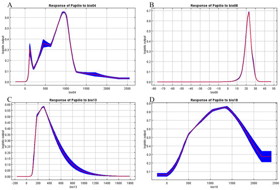 Response curve of environmental variables to the distribution probability of P. xuthus. Among them, (A) represents Temperature Seasonality (bio04), (B) represents Mean Temperature of the Wettest Quarter (bio08), (C) represents Precipitation of the Wettest Month (bio13), and (D) represents Precipitation of the Warmest Quarter (bio18). The blue areas in the figure represent the environmental response range of the ten models, and the red curve represents the average value.