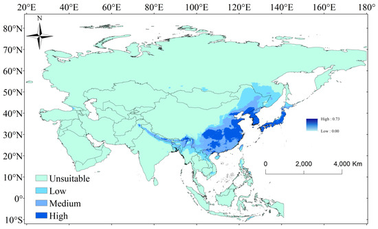 Status of the suitable climatic distribution of P. xuthus. The shades of blue from light to dark represent unsuitable, low suitability, medium suitability, and high suitability, respectively.