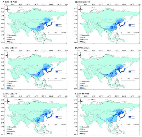 According to the prediction results under the three climate change scenarios SSP126, SSP370, and SSP585, the suitable habitat areas for P. xuthus in the 2050s and 2090s are shown in Figure 5, and the areas are presented in Table 3. In the future, the high-suitability areas of P. xuthus were predicted to migrate toward higher altitudes and show a decreasing trend. The reduction was not significant in Japan, North Korea, and South Korea, but was extremely pronounced in China. In particular, the middle and lower reaches of the Yangtze River basin saw many areas shift to medium/low suitability, leading to an overall increase in the area of medium/low suitability. In the 2050s under the SSP585 scenario, the high-suitability area was the most widespread, primarily distributed in northern China, Japan, North Korea, and South Korea, with a total area of 1531.39 × 103 km2. The distribution of high-suitability areas in the 2090s was similar to that in the 2050s, with the SSP370 scenario showing the lowest distribution of high-suitability areas, covering 1341.44 × 103 km2. Under the SSP585 scenario, the high-suitability area for P. xuthus was the largest, covering 1742.17 × 103 km2, which was close to the current distribution, with a reduction in only 4.69%. Extraction and analysis of the potential future suitable habitat areas of P. xuthus in China (Table S5) revealed that all high-suitability areas showed a decrease, with the change being significant. The reduction ranged from 24.85% (SSP126 in the 2090s) to 46.46% (SSP126 in the 2050s). The relative change in total area was greater in Asia.