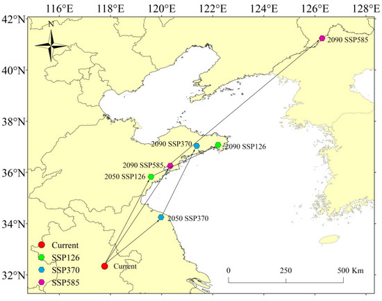 Centroid analysis of the high-suitability areas for P. xuthus revealed a significant shift in its centroid, with an overall migration toward the northeast (Figure 6). Under the current scenario, the centroid was located in Suzhou City, Anhui Province, China (32.33° N, 117.77° E). In the future, under the SSP126 scenario, the centroid was predicted to migrate to Yantai City, Shandong Province (37.07° N, 122.21° E) in 2050, and to Jining City, Shandong Province (35.82° N, 119.58° E) in 2090. Under the SSP370 scenario, the centroid first moved to Lianyungang City, Jiangsu Province (34.25° N, 119.97° E), then shifted to Rizhao City, Shandong Province (37.03° N, 121.37° E). Under the SSP585 scenario, the centroid first migrated to Weifang City, Shandong Province (36.25° N, 120.34° E), and later, in the 2090s, moved to Yanbian Korean Autonomous Prefecture, Jilin Province (41.23° N, 126.28° E).