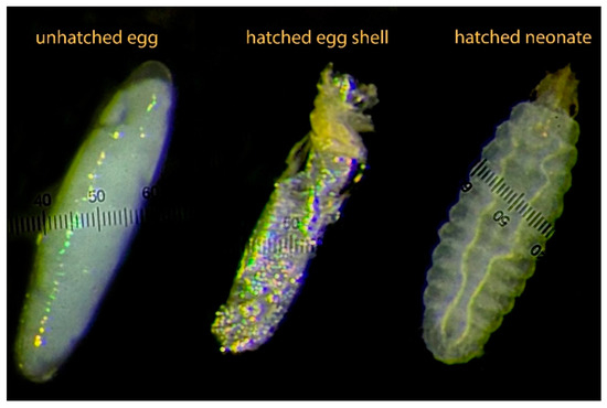 Once adults began emerging, the mating cages were placed under natural light to facilitate mating, and the cages were rotated daily to minimize location effects. Egg traps were positioned above the chicken feed, used as an attractant, and placed inside each mating cage. The traps were collected and replaced daily to measure the egg production for each treatment. Randomly selected egg clutches were incubated for four days to allow hatching, after which they were frozen. Egg hatching rates were measured under a microscope (Figure 1), and a subsample of eggs was weighed to determine individual egg weight.
