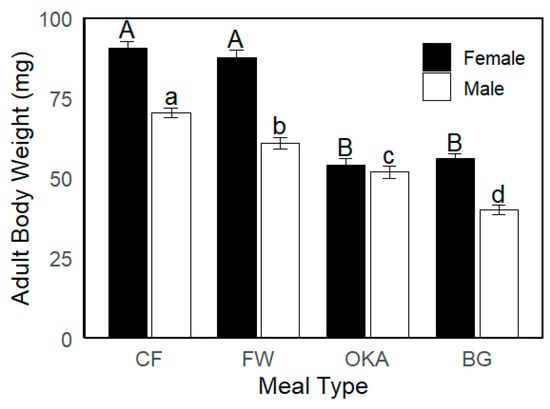 Adult body weight of black soldier fly (BSF) reared on different larval meal treatments, with sexes differentiated by bar colour. Uppercase letters indicate significantly different means for females, and lowercase letters indicate significantly different means for males (Tukey’s test, p < 0.05). Error bars represent standard errors.