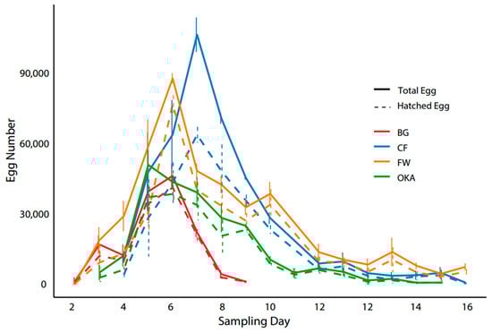 In the CF, FW, and BG groups, the peak in hatched egg numbers coincided with the peak in total egg production. However, in the OKA group, the peak in hatched eggs occurred one day after the egg production peak. The CF group experienced the lowest egg-hatching rate at the time of their peak egg production, with the gap between total egg numbers and hatched eggs gradually narrowing in the following days. In the FW group, egg hatching rates were initially very low before the egg production peak, but from that point onward—including on the peak day—the gap between hatched and total eggs remained small. OKA adults, in contrast, the hatching rate dropped sharply at the egg production peak but later stabilised at a high level, especially from Day 8 onward. Notably, while CF produced more eggs at its peak (SD 6) compared to FW’s peak (SD 5), FW had a higher number of hatchable eggs than CF (Figure 4).