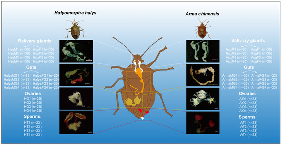 The datasets generated in these experiments were derived from 40 samples (four tissue types from two species). The collected tissues included the salivary glands, gut, sperm, and ovaries. Each experimental group included four biological replicates, and each replicate was formed by pooling tissue samples from several insects to minimize interindividual variation.