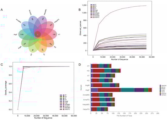 Sequencing information for the symbionts in Arma chinensis and Halyomorpha halys. (A) Venn diagram of the amplicon sequence variant (ASV) distribution. Rarefaction curve (B) and Goods’ coverage (C) of the observed species. (D) Taxon number statistics of the sequenced samples from the different organs of A. chinensis and H. halys. HT: testis of H. halys; HO: ovary of H. halys; AT: testis of A. chinensis; AO: ovary of A. chinensis; AsgM: salivary glands of male A. chinensis; AsgF: salivary glands of female A. chinensis; ArmaMG: gut of male A. chinensis; ArmaFG: gut of female A. chinensis; HalysMG: gut of male H. halys; HalysFG: gut of female H. halys.