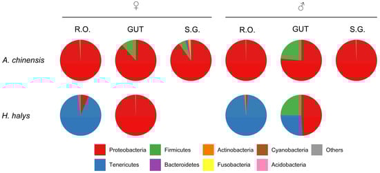 Percentage of amplicon sequence variants (ASVs) at the phylum level in the different organs of Arma chinensis and Halyomorpha halys. R.O.: reproductive organs; GUT: gut; S.G.: salivary glands; ♀: female; ♂: male.