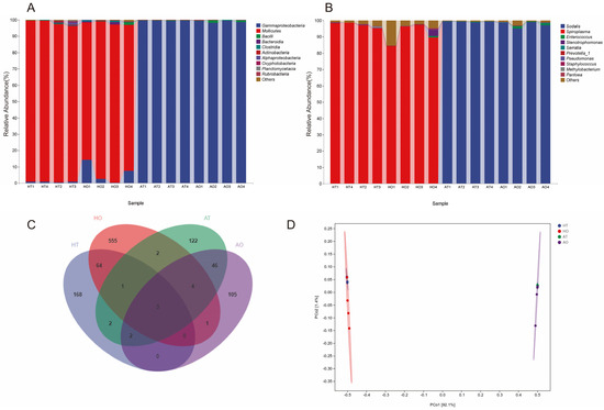 Top 10 dominant bacteria in the internal reproductive systems of Arma chinensis and Halyomorpha halys at the class (A) and genus (B) levels. (C) Venn diagram of the adult reproductive system samples. (D) PCoA analysis of the sequenced samples from the reproductive organs of the two bugs. HT: testis of H. halys; HO: ovary of H. halys; AT: testis of A. chinensis; AO: ovary of A. chinensis.