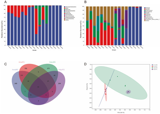 Top 10 dominant bacteria in the gut of Arma chinensis and Halyomorpha halys at the class (A) and genus (B) levels. (C) Venn diagram of the adult gut symbiotic bacteria. (D) Principal coordinate analysis of the sequenced samples from the gut of the investigated species. ArmaMG: gut of male A. chinensis; ArmaFG: gut of female A. chinensis; HalysMG: gut of male H. halys; HalysFG: gut of female H. halys.