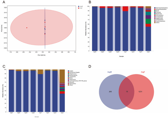 Principal coordinate analysis of the sequenced samples from the salivary glands of Arma chinensis (A). Top 10 dominant bacteria in the salivary glands at the class (B) and genus (C) levels. (D) Venn diagram of the salivary gland samples. AsgM: salivary glands of male A. chinensis; AsgF: salivary glands of female A. chinensis.