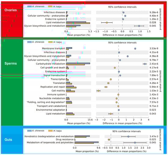 PICRUSt2 software (v2.5.3) (https://github.com/picrust/picrust2, accessed on 20 August 2024) was used to predict bacterial function based on the 16S rRNA amplicon sequencing results to understand the importance of symbiotic bacteria in the two species of bugs with different feeding habits. The predicted results showed marked differences in bacterial function between A. chinensis and H. halys (Figure 7). KEGG analysis revealed that the “lipid metabolism” pathway was markedly more enriched (p < 0.05) in H. halys ovaries, while “glycan biosynthesis and metabolism” was significantly more enriched in A. chinensis ovaries. Notably distinct from that in the ovaries, the function of the sperm microflora exhibited marked variations between the two species. For example, “replication and repair”, “cell motility”, “lipid metabolism”, and “translation” were significantly more enriched in H. halys sperm, while “carbohydrate metabolism”, “membrane transport”, and “glycan biosynthesis and metabolism” were significantly more enriched in A. chinensis sperm. The intestinal microbial functions in A. chinensis were mainly “xenobiotic biodegradation and metabolism” and “metabolism of terpenoids and polyketides”, in contrast with those of H. halys.