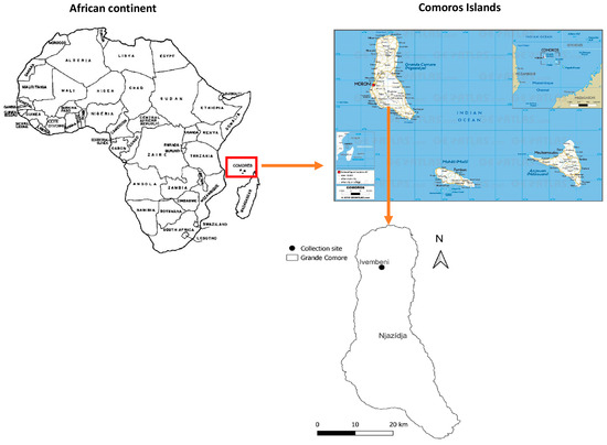 The Union of the Comoros is a country formed by three African islands (Grand Comore, Mohéli, and Anjouan) in the Indian Ocean. Geographically located north of the Mozambique Channel, in the southeast of Africa at the tip of Madagascar, the Comoros is in a strategic point facilitating trade between neighbouring countries. Through these exchanges, the country has been and continues to be exposed to the introduction of many arthropods [24,25]. However, no data on the Cimicidae fauna in the country are available.