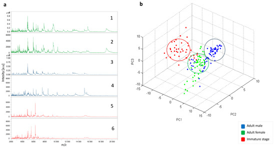 Comparison of protein profiles of Cimex hemipterus specimens using ClinProTools software and principal component analysis (PCA) showing the dimensional clustering of specimens based on their MALDI-TOF MS profiles. (a) Spectra representative of the different stages of development. (1 and 2) Spectra of adult male specimens; (3 and 4) spectra of adult females; (5 and 6) representative spectra of immature stages. (b) Dimensional distribution of specimens based on their MS profiles. au, Arbitrary unit; m/z, mass/charge ratio.