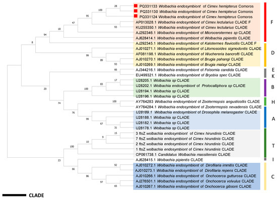 The DNA of 145 C. hemipterus specimens was used to detect bacteria by qPCR. Only 67/145 samples (46%) tested positive for bacteria of the Anaplasmataceae family. All samples that were positive for bacteria of the Anaplasmataceae family tested with the 23S rRNA gene were found to be positive for Wolbachia using specific qPCR with the 16S rRNA gene. For the other bacteria tested, all samples were negative. The ten sequences obtained from the Wolbachia-positive samples with FtsZ showed 100% identity to the corresponding sequence in the complete genome of the Wolbachia endosymbiont isolated from C. lectularius (GenBank: AP013028) from Japan and were deposited under accession numbers ranging from PQ381124 to PQ381133. Using the maximum likelihood method, phylogenetic analyses revealed that our sequences belonged to supergroup F (Figure 5).