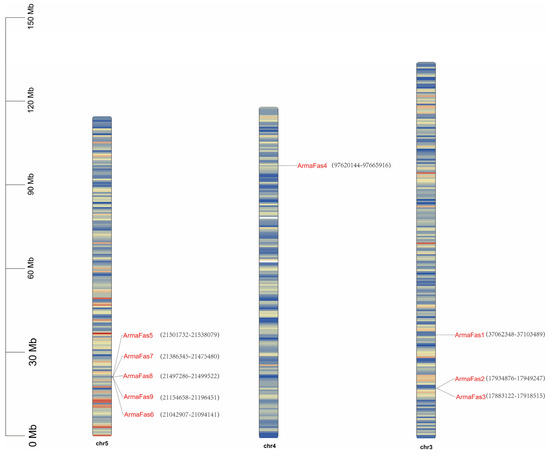 We identified nine FAS genes in the A. chinensis genome database and named them ArmaFas1–9. We mapped the loci of these nine genes to three putative A. chinensis chromosomes using chromosomal location analysis (Figure 1). The genes were distributed across different chromosomes rather than being clustered together, and the sizes of the expressed proteins varied, ranging from 751 (ArmaFas8) to 3088 (ArmaFas1) residues (Table S2). For example, ArmaFas1, ArmaFas2, and ArmaFas3 were located on one chromosome, ArmaFas4 was present on a second chromosome, and ArmaFas5, ArmaFas6, ArmaFas7, ArmaFas8, and ArmaFas9 were closely located on a third chromosome.