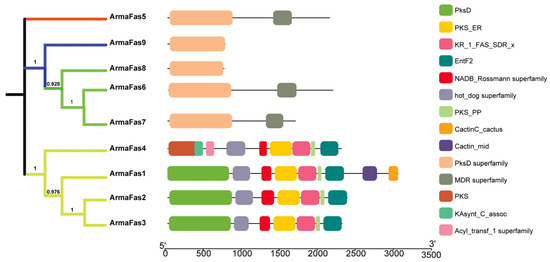 We sequentially compared nine FAS genes of A. chinensis (Table S3) and constructed a phylogenetic tree based on 1000 bootstrap repeats using the maximum-likelihood method. Domain analysis indicated that ArmaFas8 and ArmaFas9 possess only the PksD superfamily (Figure 2). These results suggest that ArmaFas1–7 and ArmaFas8–9 do not perform identical functions, possibly due to the distinct roles of the synthesized fatty acids.