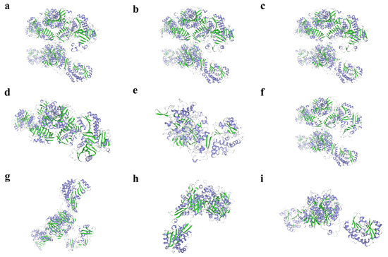 Prediction of the three-dimensional structure of fatty acid synthase proteins of Arma chinensis. (a–i) ArmaFas1–9 proteins, respectively. Green represents the beta fold, and purple represents the alpha helix.
