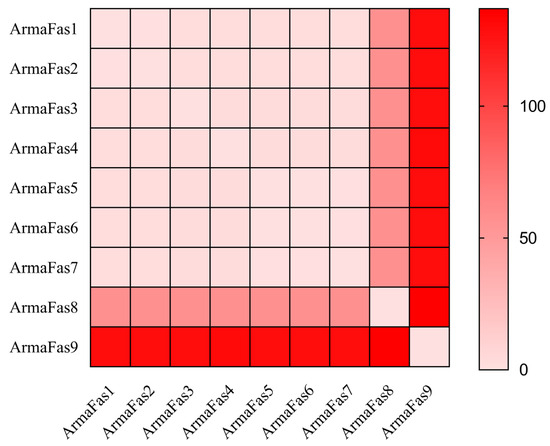 The RMSDs of the FAS structures of A. chinensis were calculated to assess the structural variations (Figure 4). Except for ArmaFAS8 and ArmaFas9, the RMSD between ArmaFAS1–7 were all between 0 and 2. The RMSD of ArmaFas8 was approximately 56, while that of ArmaFas9 was approximately 130. Moreover, the RMSD between ArmaFas8 and the other ArmaFAS proteins was the highest. These results indicate that the 3D structure and conserved motifs predicted for ArmaFas9 were significantly different from those of ArmaFas1–8.